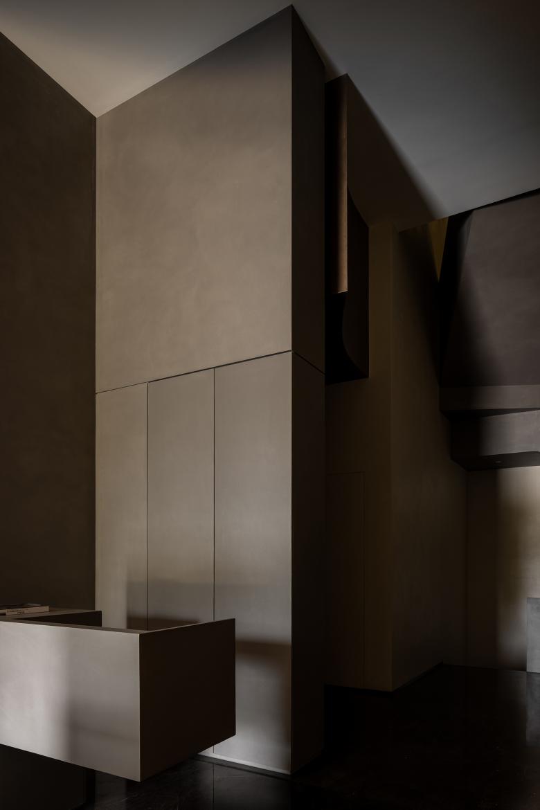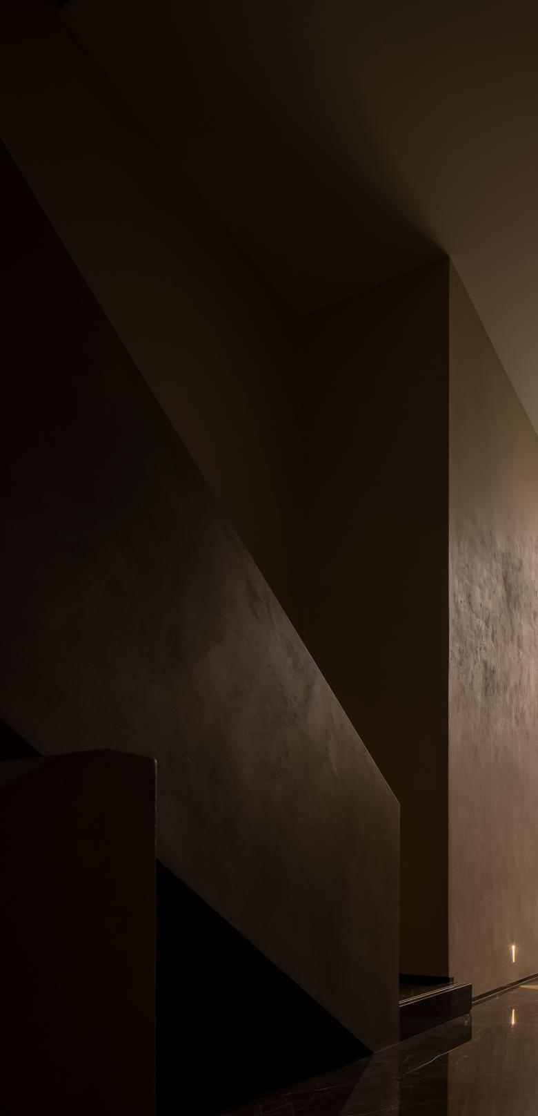 Walls clad in stone-texture paint contrast with the metal materials, injecting a sense of luxury into the comfortable space. Soft light accentuates the sense of weight in the space. The "floating" blocks strike a balance between heaviness and lightness, adding fun to the space.