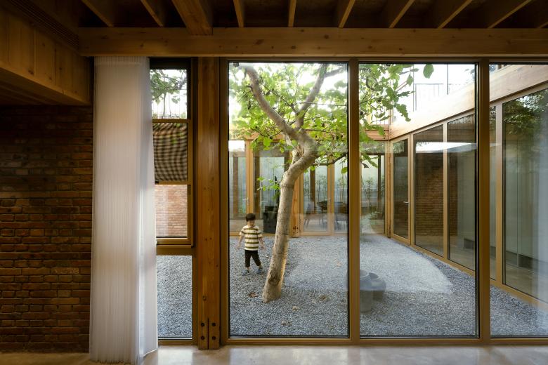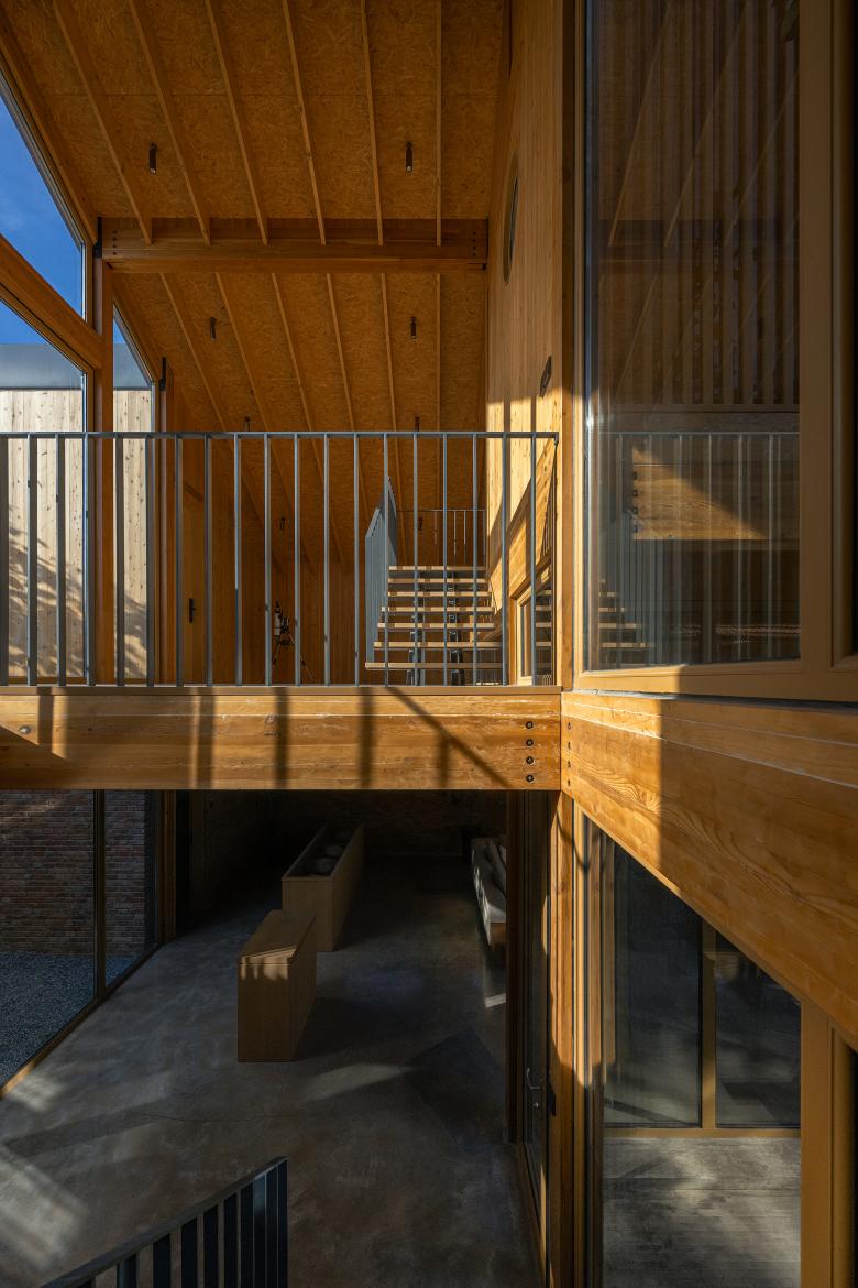 The building is organized around the trees, forming two well-proportioned courtyards that bring in ample sunlight and views of seasonal changes. This layout continues the traditional courtyard house typology of the village. The main structure is crafted from glued laminated timber, which, beneath the double-pitched roof, supports a variety of staggered platform spaces, evoking the sensation of living amidst a forest.