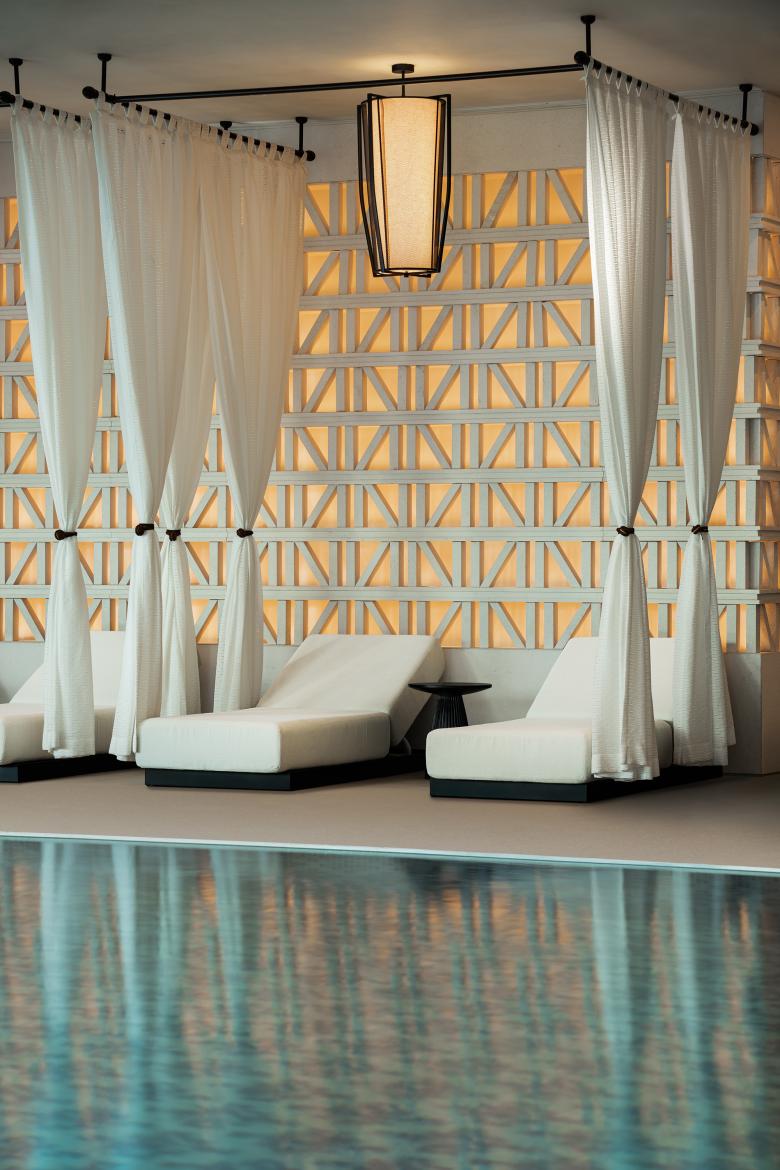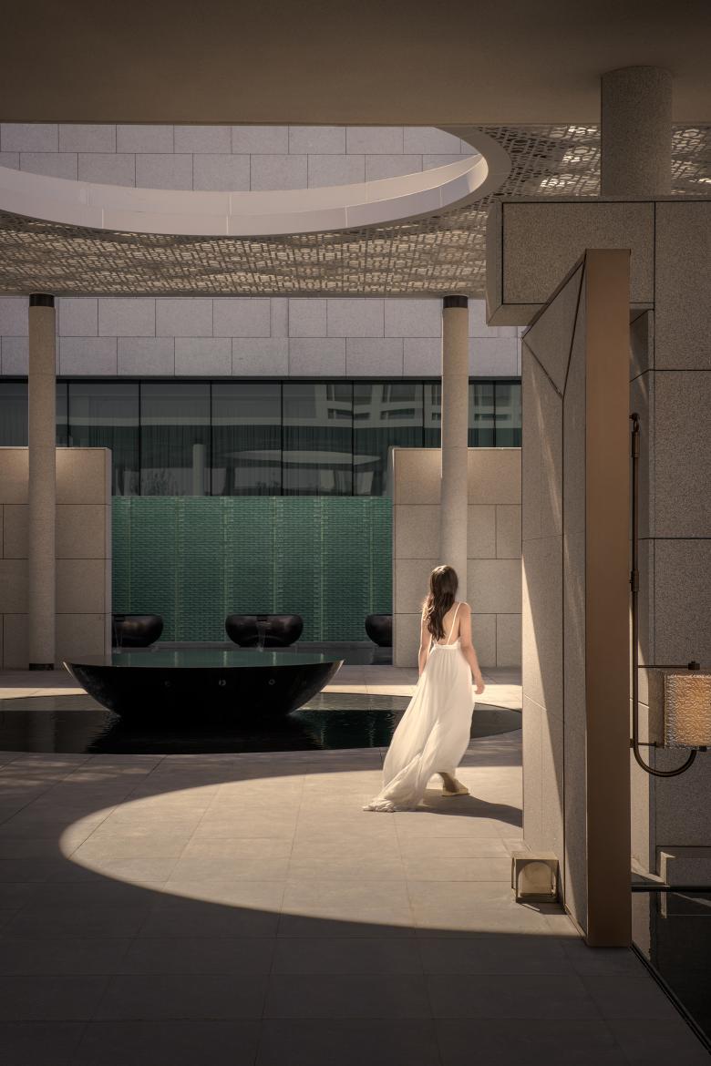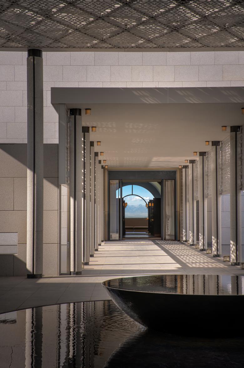 Beyond the city’s clamor, guests are welcomed into a tranquil retreat, where a manor-style garden sets the prelude to a ceremonial journey of discovery. Inspired by traditional courtyard dwellings in the Ili River Valley, the entrance unfolds as a tri-winged architectural cluster. Four distinct courtyards compose a rhythmic spatial sequence that flows from openness to intimacy, gently guiding guests through a subtle transition of mood. Local elements are reimagined through contemporary materials and craftsmanship—with the iconic blue palette of Yining houses and the intricate Kazakh wood carvings translated into refined architectural touches, most notably in the porch details. Shimmering water animates the buildings, leading travelers into a sanctuary of serene elegance.