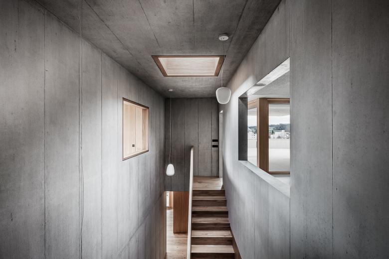 Als Antwort auf die Umgebungseinflüsse bildet das Gebäude eine klare Vorder- und Rückseite. Die Fassade grenzt mit minimierter Fläche geschlossen an die Strasse und fächert sich durch die Abwinklungen zur Südseite auf. Dadurch wird ein möglichst grosser Bezug zur Aussicht generiert. Der Innenraum zeichnet sich durch geschlossene und offene Bereiche aus, die zu einer freieren Raumabfolge und unterschiedlichsten Sichtbezügen führen.