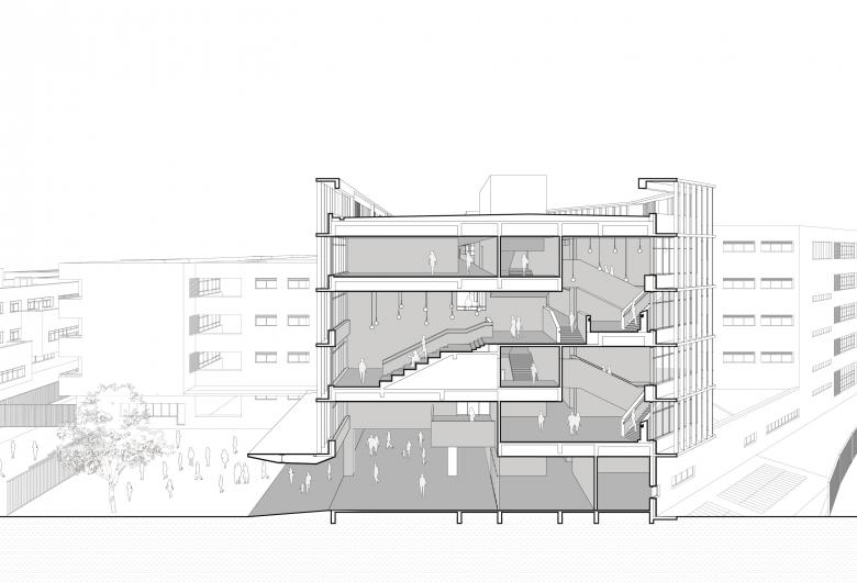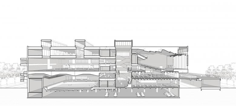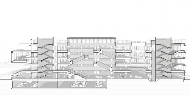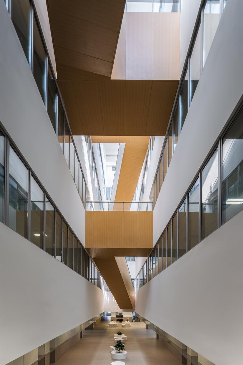 According to the surrounding urban spatial relationships, the playground is designed to be located in the southwest of the campus. The whole campus is divided into five relatively clear functional areas from south to north, namely, Department, Primary School Department, Comprehensive Teaching Department, Junior High School Department and Sports & Recreation Department. The challenge lies in how to create the composite and shared use of different functional areas on the premise of meeting the functions of various parts and streamlining rationality. The ultra-high spatial density of New Bund School urges us to define this composite campus space with two types of space: platform and courtyard.