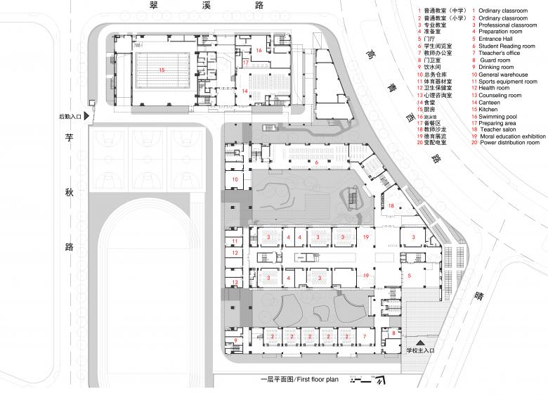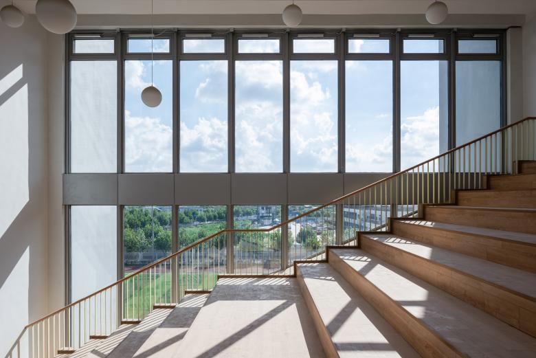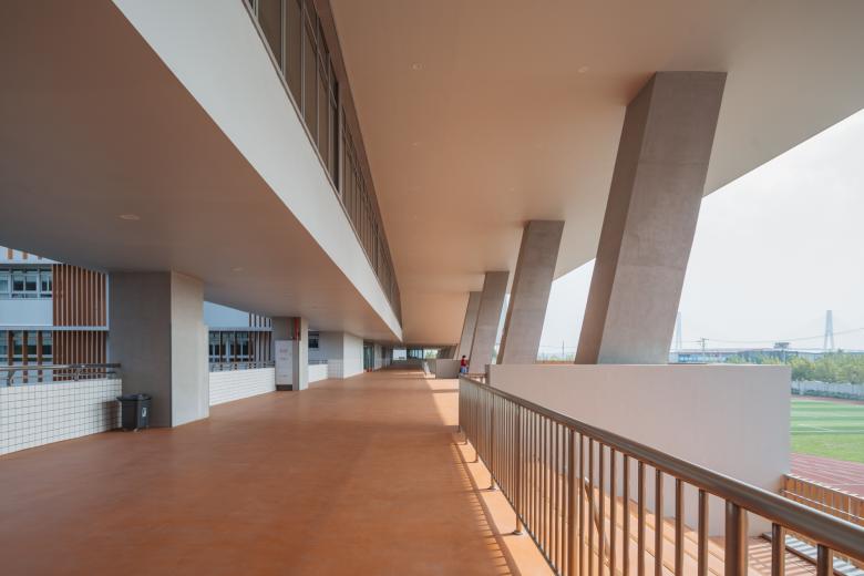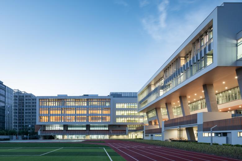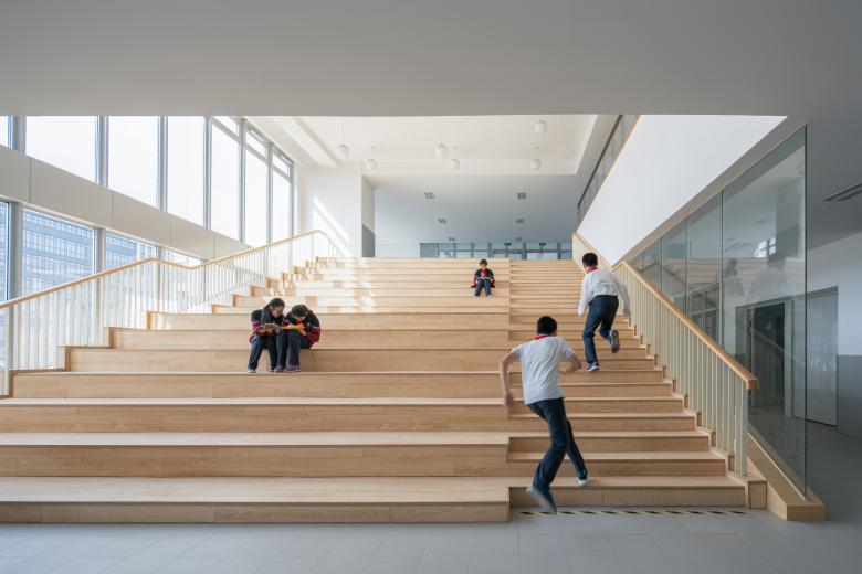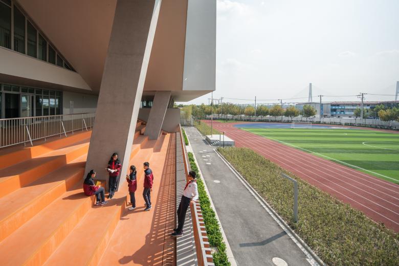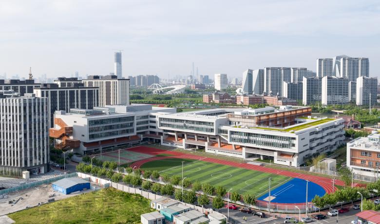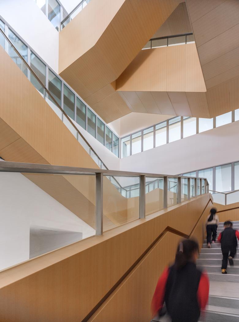 The New Bund School, which combines nine-year system primary and secondary schools with kindergarten, is located in Riverside International Community in the southwest of Shanghai New Bund International Business District. Although the school plot is large, the plot ratio is close to 1.5, which will certainly make it a high-density campus. Therefore, the design of the New Bund School needs to effectively respond to the urban public environment on a macro-scale, while on the micro-scale, it needs to form a campus environment with efficient spatial organization and convenient communication based on the demand for horizontal and vertical spatial compounding.
