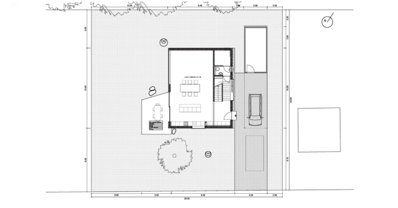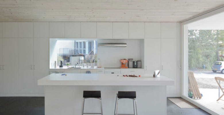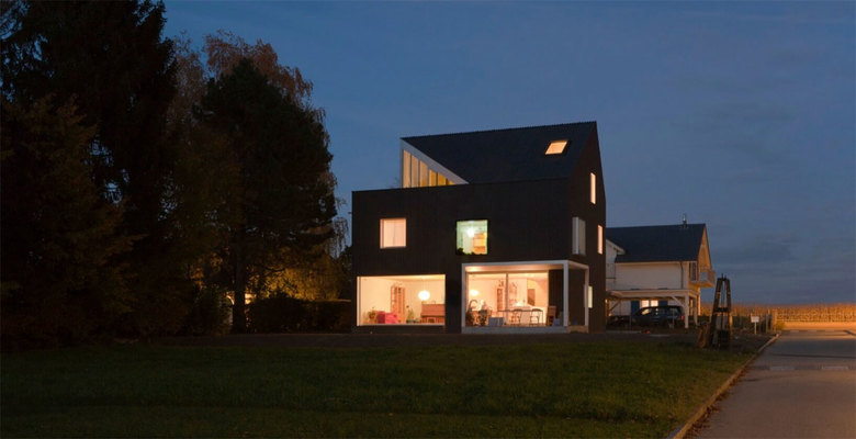 This house for a family of four is located in Bellmund, Switzerland, nearby Biel. Situated on a small plot, the structure’s “house” shape maximizes its height to ensure views of Lake Biennem, while a terrace space is cut from the roof volume. The house has a wood structure, as is usual in Switzerland. The skin is clad in grey industrial panels – a rough and weather resistant material with low costs. In contrast to the modest and functional exterior, the wooden structure is revealed within to give the interior an inviting sense of warmth.