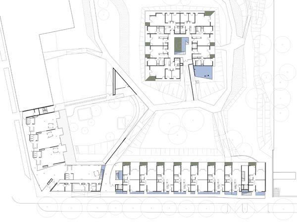 Schwebend über einer durchgängigen Parklandschaft finden sich Stadtvilla und L-förmiger, straßenbegleitender Riegel.