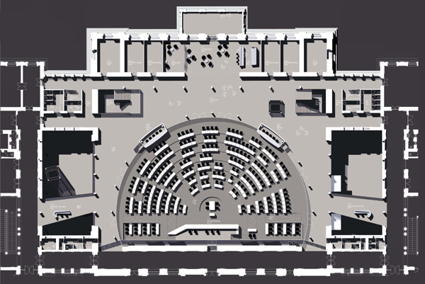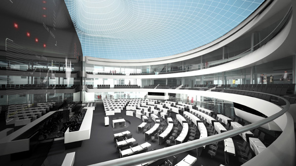Das Parlamentsgebäude von Theophil Hansen lässt sich nicht nur als integraler Bestandteil der Stadt begreifen, sondern auch als Stadt in sich, als eine komplexe und dichte Raumfigur, die die gesellschaftspolitischen Verhältnisse des 19. Jahrhunderts repräsentiert. In der städtebaulichen Integrität der Ringstrasse soll die äußere Silhouette des Parlamentes gewahrt bleiben, um so wichtiger ist es für eine zeitgemäße Identität des Gebäudes, sich von Innen her als demokratisches Forum des Politischen Diskurses zu öffnen, und der heutigen engen Verknüpfung zwischen Gesellschaft und Nationalrat angemessenen Raum zu geben. Die Neugestaltung des Plenarsaals bietet nun die Chance, für eine wandlungsfähige, freie Bürgergesellschaft einen zeitgemäßen Rahmen zu schaffen, der demokratische Grundbegriffe wie „Offenheit“ und „Transparenz“ auch architektonisch verkörpert.