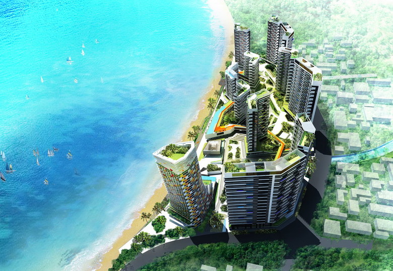 景觀語言現代簡約,注重平面構圖、綠化、鋪裝與景觀小品形成一氣呵成的流暢感,每個裙樓體塊內部形成獨立的主題庭院,同時又各自連接到中心庭院;不同高度的垂直綠化,裙樓景觀和屋頂花園,構建大型的生態社區;水元素是濱海專案的主題,而這一主題不應僅僅限於在海灘上,設計中在裙樓與屋頂提供了不同高度的水景以及無邊界泳池,極大地豐富不同層次的水上體驗。