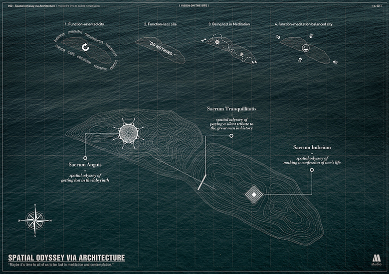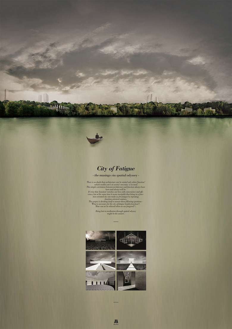 It's not too much to say that 'function' is translated into 'architecture' and 'architecture' is organized to form the current 'city'. This function-based city offers various functions to enrich our daily lives with convenience and it seems that there is no other needs to satisfy. Besides convenience of function, this project starts from the situation that people are being fatigued by endless loop of daily routine. If city gives you fatigue continuously, city will be 'city of fatigue'. As I think architecture ought to be a good public toward the society, this project decides to make well-balanced city with a sense of duty. This project is proposing that setting out on a journey like a character in novel can be a way of getting out from function-based city and endless loop of daily routine which gives you the fatigue. A journey full of spatial experiences -spatial odyssey- will lead you to feel free from your everyday life. It's doesn't mean that escaping from the reality is an answer, it means that finding one's composure who is fatigued is absolutely necessary in the current 'city of fatigue'. While designing, distinctive environment contrary to function-based city is in need, therefore function-less site -Bamseom(islet)- has chosen to be the environment of spatial odyssey for the fatigued. The most important thing in this site is to feel and meditate by own way through built-environments. These environments won't compel you to do something, they only lead you to follow your heart and feel relieved. During your spatial odyssey, you'll face monolith group of towers, see lights pouring from the upper part of towers, walk through endless path of tranquility and stand at the crossroads by getting lost in the labyrinth. As there are no fixed actions to do and emotions to feel, you may make a confession of your life, pay a silent tribute and start your adventure in the labyrinth like a character in novel. While you are feeling the spaces with your heart, you'll find yourself meditating, meeting the composure and finally being relieved. If you are fatigued, it's time to go on your own spatial odyssey to find your composure.
