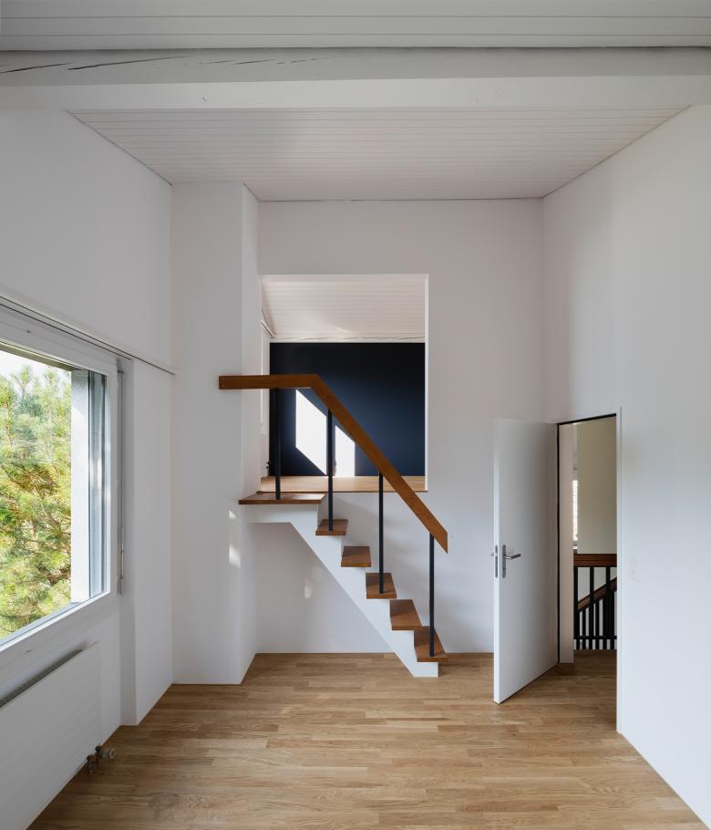 Das Einfamilienhaus in Zufikon aus dem Jahre 1979 besticht durch die Qualitäten der Haupträume, dem Schlafgeschoss zum Garten und der Weitsicht. Das Haus wird über das oberste Geschoss erschlossen und entwickelt sich über einen überhöhten Wohnbereich nach unten in das Schlafgeschoss. Durch die wärmetechnisch verbesserte Decke, einem neuen Cheminée und einer offenen Küche entsteht ein spannendes und grosszügiges Raumgefüge. Das Farbkonzept mit starken aber zurückhaltenden Farben macht in Kombination mit den gezielten und sorgfältigen Eingriffen die schon bestehenden Qualitäten des Hauses besser erlebbar.
