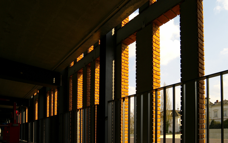 In die vorstehenden tragenden Lisenen (Mauerblenden) sind die horizontalen Riegel eingehängt. Diese Lisenen übernehmen die vertikale Gliederung des Parkhauses. Drei „Fugen“ sollen die Länge des Parkhauses optisch in vier „Häuser“ teilen. Diese „Fugen“ bestehen aus gefärbten Sichtbetonlamellen gleichen Formats, die durch zu- bzw. abnehmenden Lamellenabstand eine Verlaufsstruktur erzeugen, allerdings mit größerem Abstand auch bei den Backsteinpfeilern auftaucht. Hier wechselt nicht nur der Abstand, sondern auch das Format.