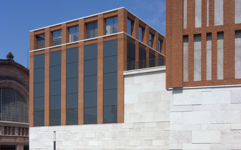 Das Parken nicht nur in zwei Untergeschossen unterzubringen, sondern auch als Hochbau auf dem eigenen Grundstück war eine Entscheidung für den öffentlichen Raum als offen gestaltetes Parkhaus mit hoher Identität für den Ort. Die Lärmemissionen sind durch die tiefe vor gehängte Steinfassade (30 – 40 cm) reduziert. Das Energiesparkonzept besteht darin, keine aufwendige Lüftungsanlage zu benötigen, daher das Konzept: „offenes Parkhaus“.