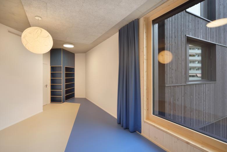 Das Gebäude wurde in Hybridbauweise erstellt und ist mit dem Minergie-P-Label zertifiziert. Das Untergeschoss, die Decken und statisch relevanten Wände sind aus Recycling-Beton, die Aussenwände wurden aus vorgefertigten Holzbauelementen erstellt. Die Fassade ist mit einer hinterlüfteten Holzschalung verkleidet. Im Gebäude dienen die bestehenden Identifikationsfarben der Gruppen den Eltern und Kindern neu auch der Orientierung: Sowohl die Signaletik als auch die Oberflächengestaltung der Boden-, Wand und Einbauelemente übernehmen die entsprechende Zuordnung. Zu den Haupträumen hin wird die Farbgebung ruhiger – helle, natürliche Töne und die Holzverkleidung der Aussenwände bestimmen das Raumgefühl.