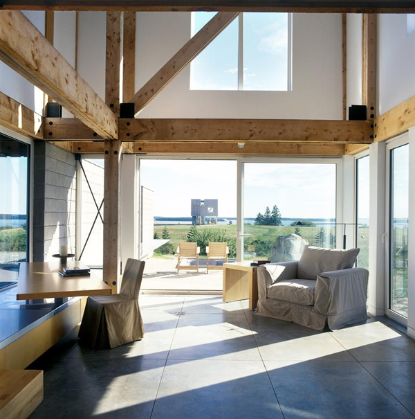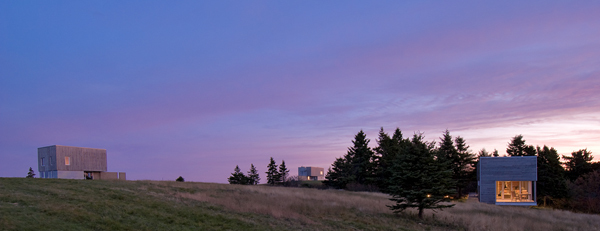 This house is located where the LaHave river meets the sea on Nova Scotia’s Atlantic coast. A pair of lantern like buildings float above the hilltops: one overlooks the river estuary and the other the ocean; one contains the main house and the other the guest house. These two structures sit on drumlins and are aligned on a north-south axis. The natural wetland formed between the drumlins is embraced as a ‘central garden’ and a wildlife corridor through the site. The mirrored minor and major buildings are separated by approximately 450 feet, but are linked by concrete