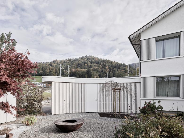 Der Erweiterungsbau lehnt sich an die Architektur-sprache des Bestandes- und Erweiterungsbaus an und zeichnet in seiner organischen Form die Struktur des bestehenden Garten's nach. Trotz sichbarer Geschichte des Hauses sollen sich die zwei Erweiterungsbauten zusammen mit dem ursprünglichen Bau zu einem Ganzen verbinden.