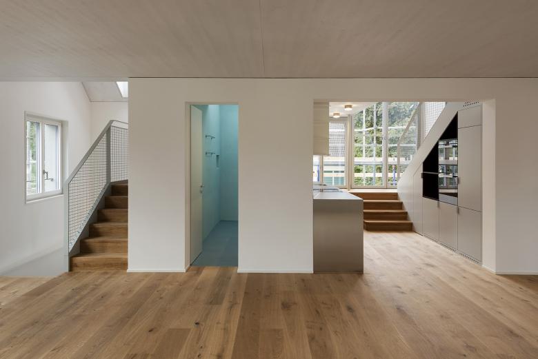 Im Bereich der Maisonettewohnung wird eine grosszügige, über zwei Stockwerk verlaufende Lukarne als neues Element eingeführt. Die Küche, der Ausgang auf die Terrasse und die Treppe ins Dachgeschoss sind darin konzentriert und bilden das Herzstück der Wohnung. Unmittelbar nicht benötigte Raumtrennungen können zu einem späteren Zeitpunkt erstellt werden, um eine Flexibilität der Nutzung zu generieren.