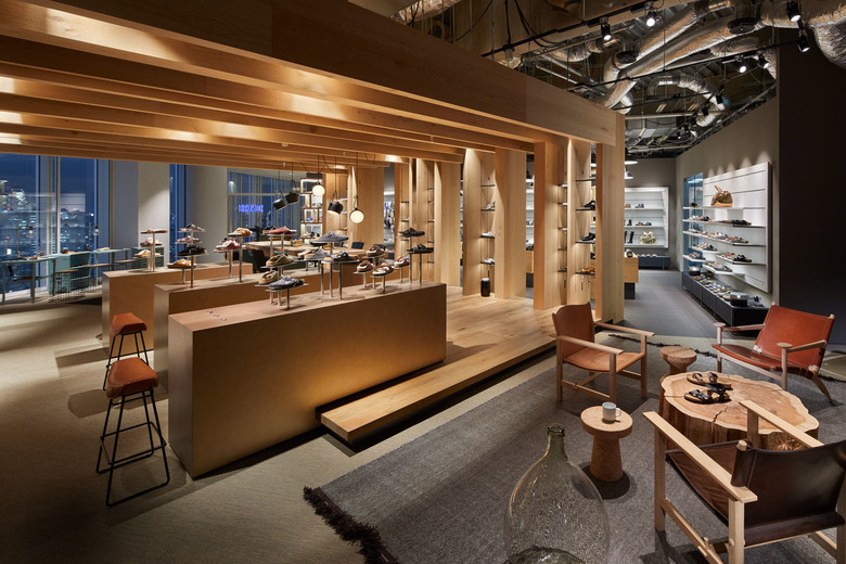 Der Showroom mit Meeting-Bereich und angeschlossenen Büros verbindet Wohlfühlqualität mit urbaner Gelassenheit. Typische Materialien für die hier präsentierte Schuhmode wie Leder, Filz und Kork prägen die Einrichtung und schaffen einen warmen Gegenpol zur Stahl-Glas-Fassade der Architektur. Massive Eichenbohlen bilden einen offenen Raum-im-Raum für Kundengespräche oder informelle Meetings. Eine „Branding Wall“ und „Presentation Tower“ bieten flexible Möglichkeiten der Präsentation. Neben der offenen Deckenstruktur tragen auch Leuchten und Metallmöbel im Industrial Chic zum besonderen Ambiente bei.