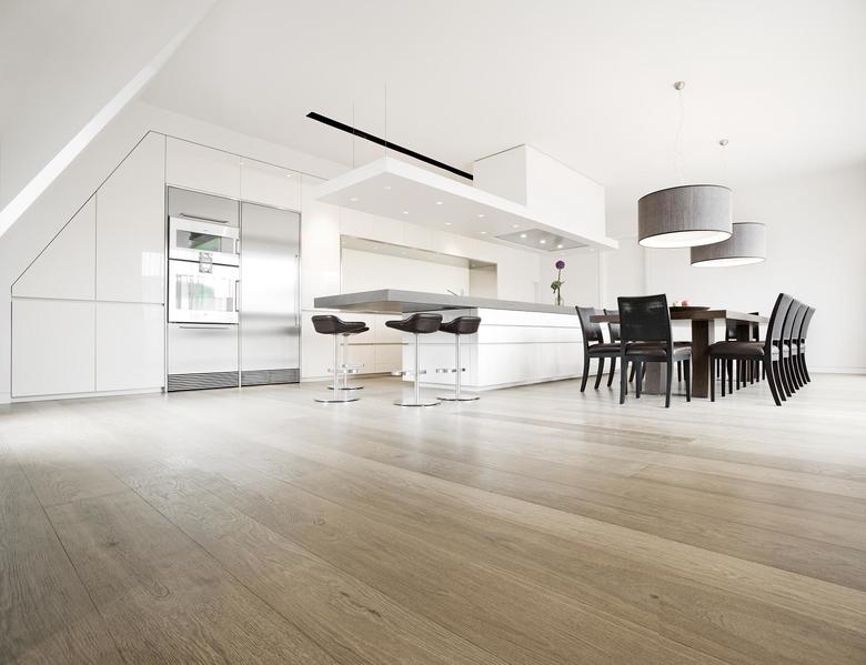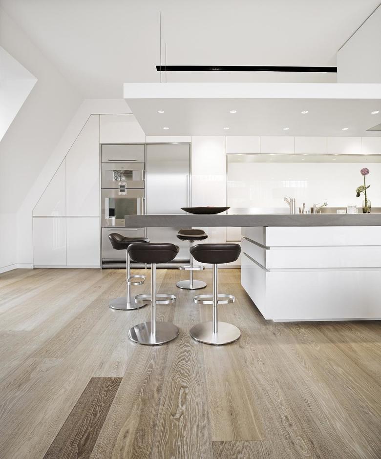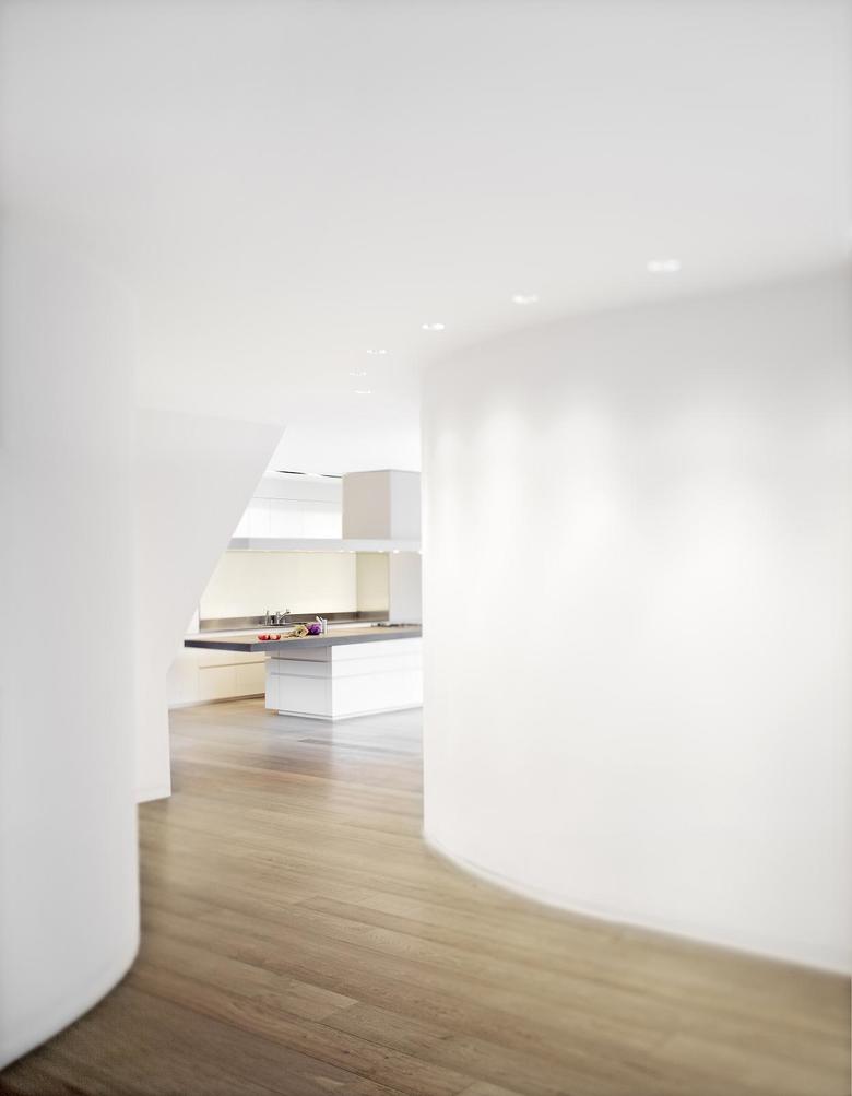 Vor dem Umbau hat ein enger Verbindungsgang das Hauptgebäude mit dem Seitentrakt verbunden. Nun lassen zwei gegenläufig gerundete Wände die Räume ineinander fließen. Zentrum des häuslichen Lebens ist die Küche. Die schwere Natursteinplatte der Kochinsel kragt nach einer Seite aus. Trotz ihrer beachtlichen Größe von knapp fünf Metern scheint es, als schwebe sie über den weißen Unterschränken.