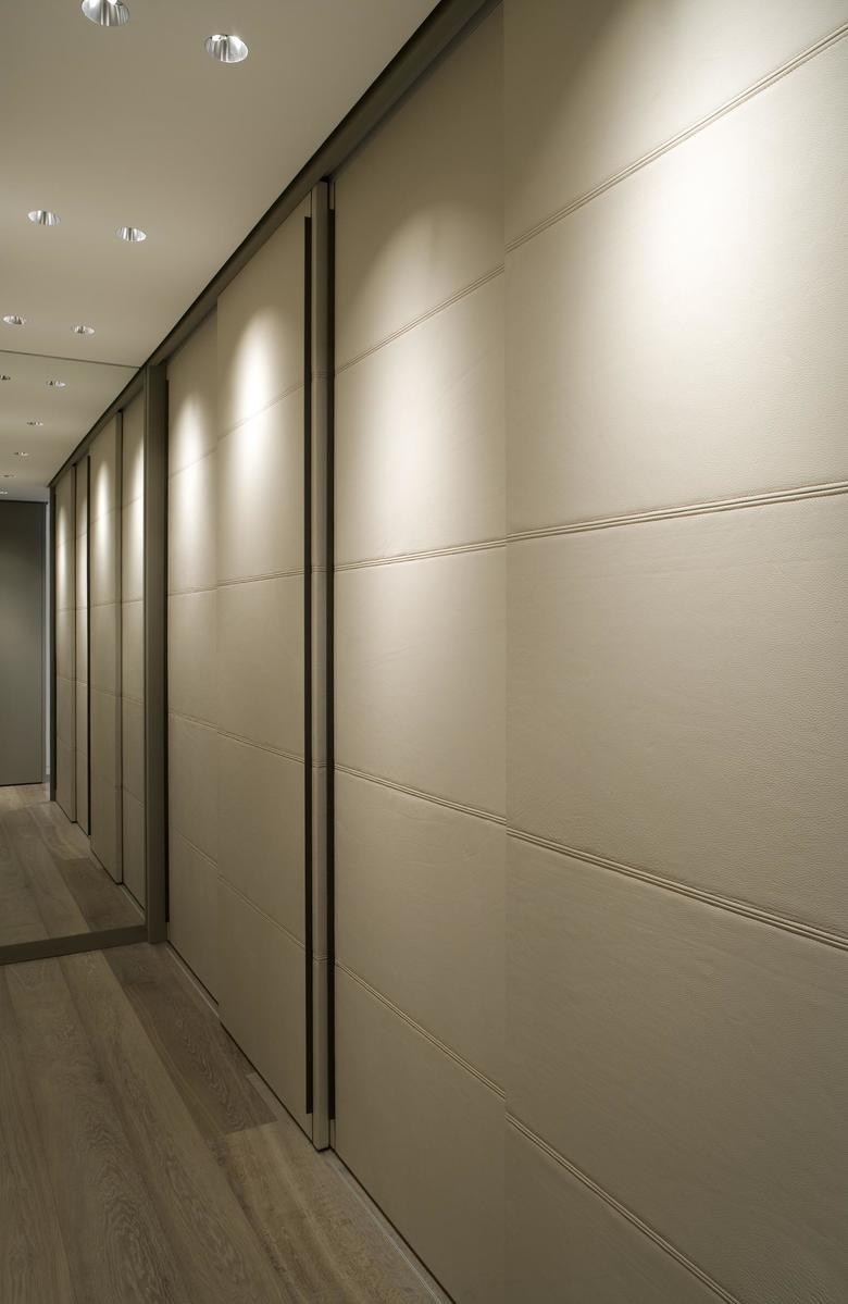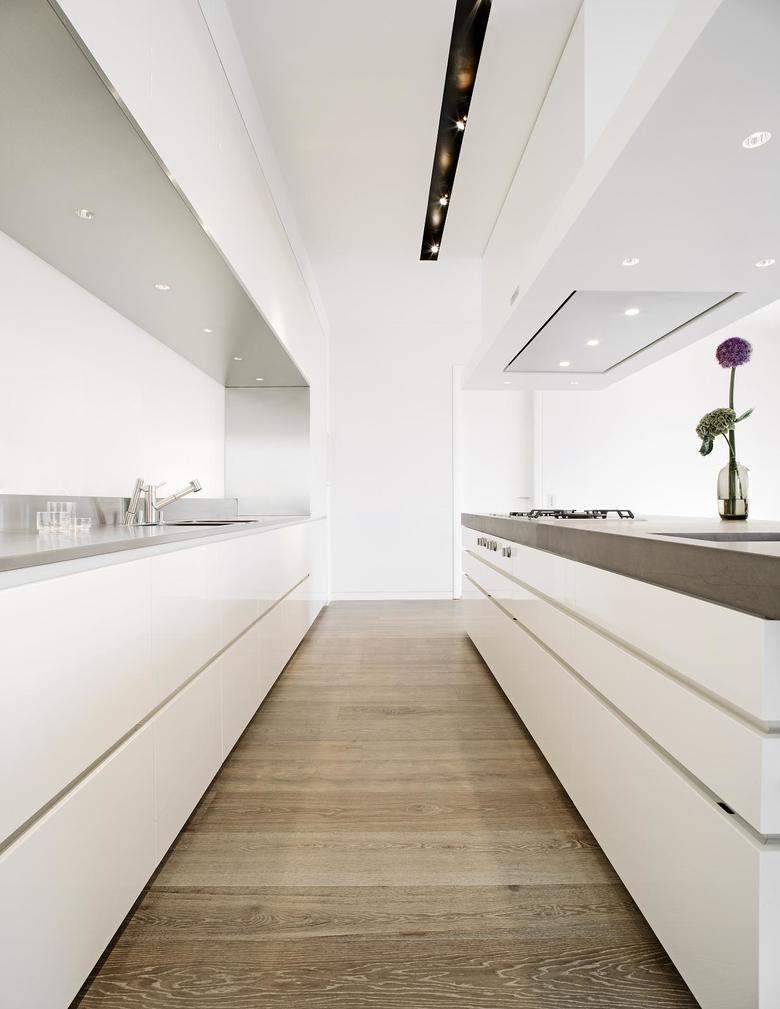 Eine Vielzahl baulicher Detaillösungen ist individuell für dieses Projekt angefertigt. So sind zum Beispiel die beleuchtete Arbeitsnische und die Edelstahlfronten der Elektrogeräte zusätzliche mit Edelstahlwangen eingefasst, deren Oberfläche identisch ist mit der der Elektrogeräte. Das Ausgussbecken und die Arbeitsplatte der Kochinsel sind aus dem gleichen Stein gefertigt. Anders als die Platte ist das Becken jedoch aus einem massiven Block herausgefräst. Und überall dort, wo Lichtschalter nicht auf fein gespachtelten Wänden sitzen, sind sie als dezente Klingelknöpfe in Möbeln und Wandbekleidungen integriert.