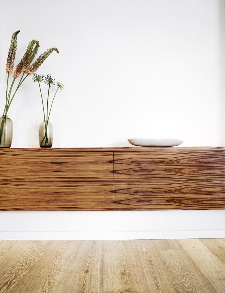 Der Farbton des Eichendielenbodens, das erdig-graue „Taupe“, zieht sich durch die gesamte Wohnung. Helle Eierschaltöne und tiefes Goldbraun massiver Bronze ergänzen die Farbpalette. Vereinzelt stechen elegant gemaserte Edelholzmöbel aus dem Kanon heraus.
