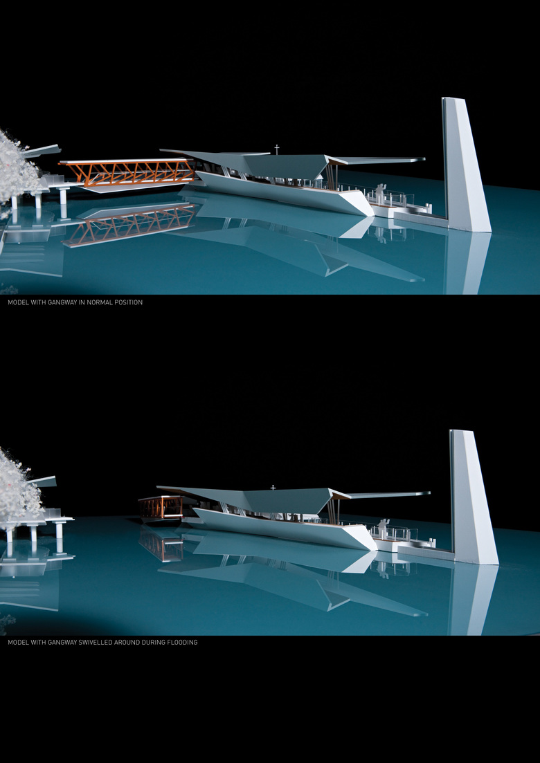 The self-imposed aim of our project was to simultaneously solve the problem of future flood resilience and create floating spaces where all people can in benevolent climatic times enjoy the interface between the city and its defining river.