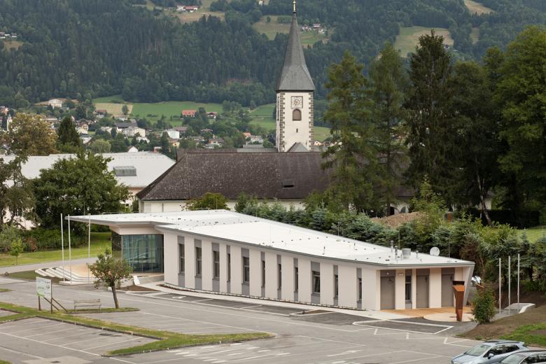 Konzept – Das neue Bürgerservicezentrum für Ossiach ist als eingeschossiger Pavillonbau in die Landschaft platziert. Es wurde ein demokratischer, teilweise transparenter Baukörper konzipiert und ausgeführt der sich im Wesentlichen in 3 Bereiche gegliedert. Den Eingangs-, Foyer- und Infobereich, den Infobereich Tourismus sowie den administrativen Bereich.