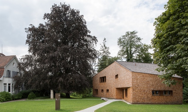 Die Aussenhaut und die Dacheindeckung des Gebäudes, das als vorfabrizierter Holzrahmenelementbau hergestellt wurde, sind mit naturbelassenen Holzschindeln aus Lärchenholz verkleidet.