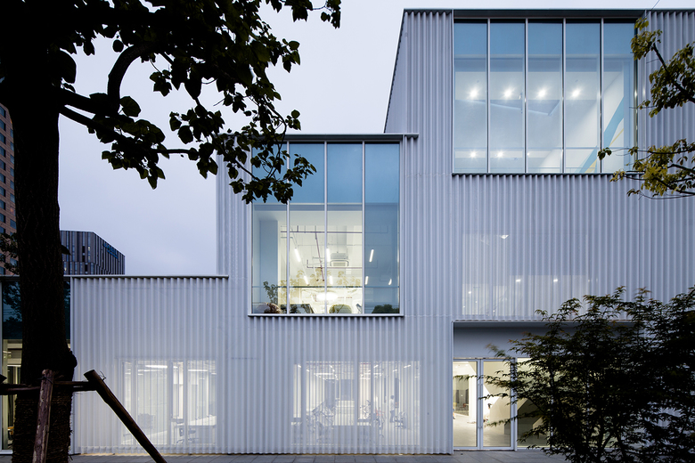 Commissioned by CaoHeJing in 2014, Schmidt Hammer Lassen architects' proposal was to overclad and unify the existing rendered concrete facade utilising a corrugated and perforated polyester powder coated aluminium skin.