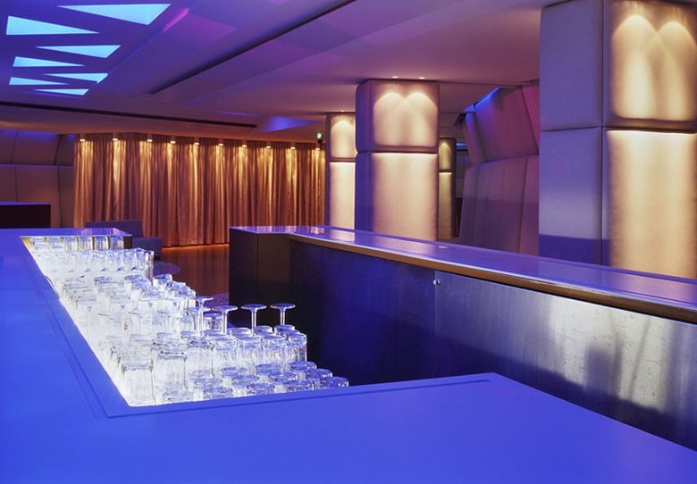 Nur noch eine der Zugangstreppen führt als Eingang hinunter in den Clubraum. Drei Bars schmiegen sich an den zentralen Tanzbereich des Clubs und zonieren den Raum. Entlang der Außenwände gruppieren sich Sitzmöbel, die in ruhigere Lounge-Zonen überleiten. Die primenförmigen Ausschnitte in der Stahlbetondecke - ein Überbleibsel aus Unterführungszeiten - beinhaltet die Beleuchtung des Raumes und verleiht ihm sein prägnantes Erscheinungsbild.