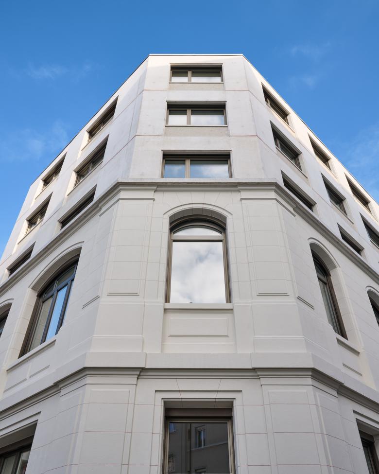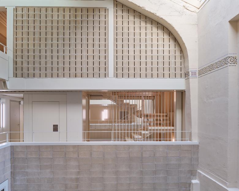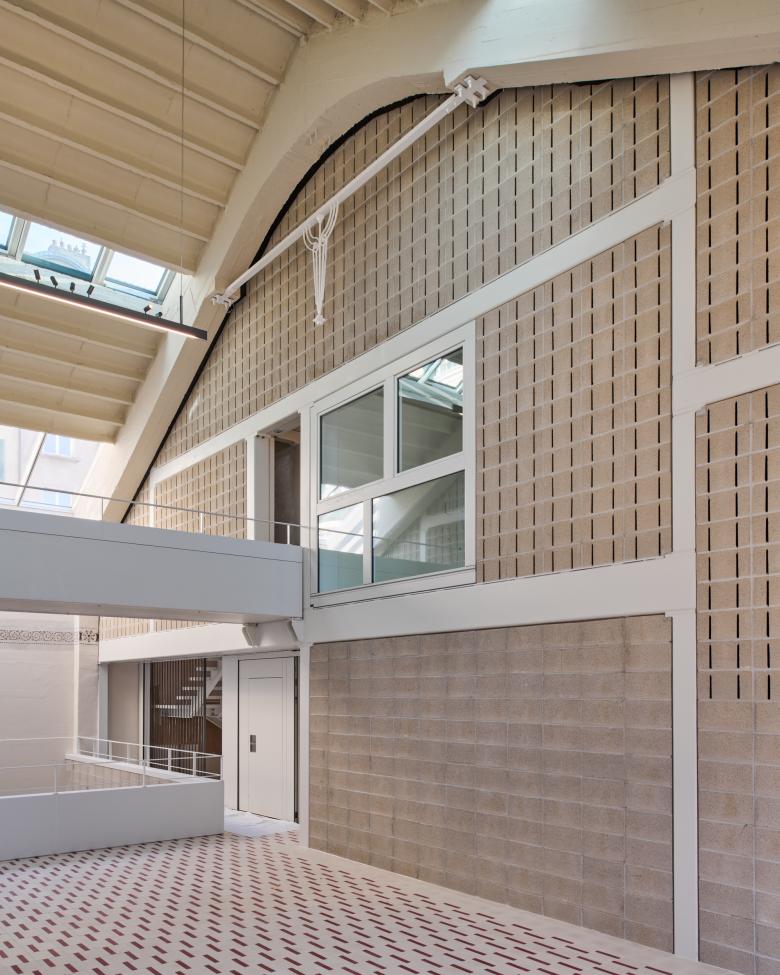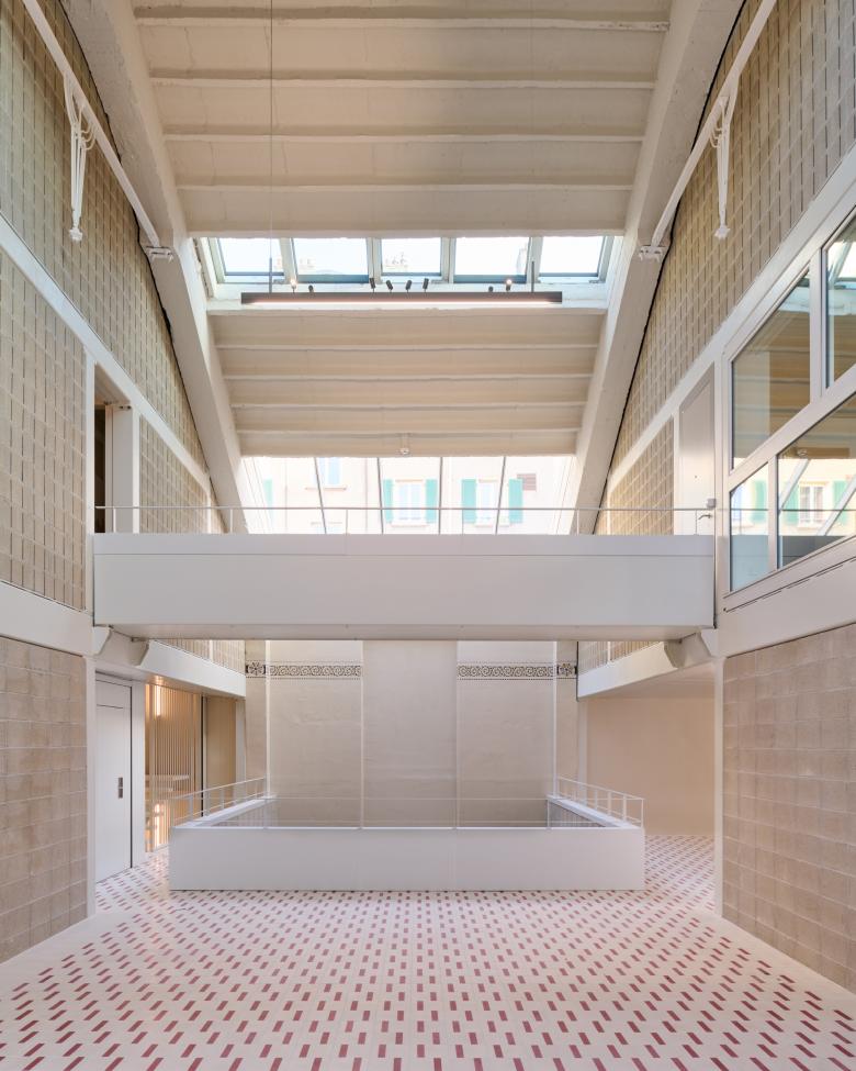 Mais la voiture se démocratise et la centralité de nos villes ne l’accueille plus si volontiers. Le garage reste inoccupé de nombreuses années, un peu oublié, malgré sa spatialité remarquable. Opération de la dernière chance, sa reconversion actuelle en logements s’inspire et fait vivre cette spatialité en insérant les logements dans la trame dictée par la structure. Massifs et articulés autour de 2 nouvelles cours sous la dalle symbolique du niveau d’entrée de l’Avenue de Morges, ils se font légers, en remplacement des équipements mécaniques dans la grande halle. Dans celle-ci cousent de grands volumes qui gardent lisibles toute sa hauteur, profondeur et largeur originelles. Les choix constructifs sont au service de la structure première, de manière à la révéler et à s’enrichir de sa beauté mécanique. La charpente métallique et la brique de ciment répondent au béton maître des lieux dans un même souci de valorisation de l’abondante lumière tombante des verrières. Les nouvelles façades sont réalisées en préfabrication foraine dont les éléments de béton blanc sont assemblés à joints rouges, dans le prolongement des teintes et du dessin originel des façades de 1913. Notre intervention se veut dans l’esprit de ce bâtiment doté d’une note 3 au recensement architectural du canton de Vaud en respectant au plus près les objectifs de conservation dans sa mue vers son nouveau programme.