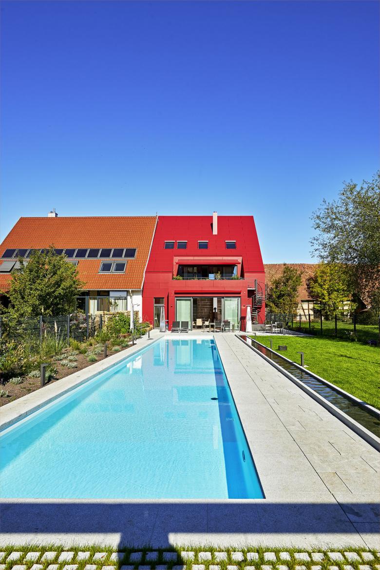 Zweifelsohne ein richtiger Hingucker ist dieses im Jahr 2016 errichtete Wohnhaus im idyllischen Pleidelsheim. Der Architekt wollte bewusst auffallen, sein Vorhaben ist sichtlich gelungen. Die gesamten Dach- und Fassadenflächen wurden mit roten Zenor-Faserzementtafeln verkleidet.