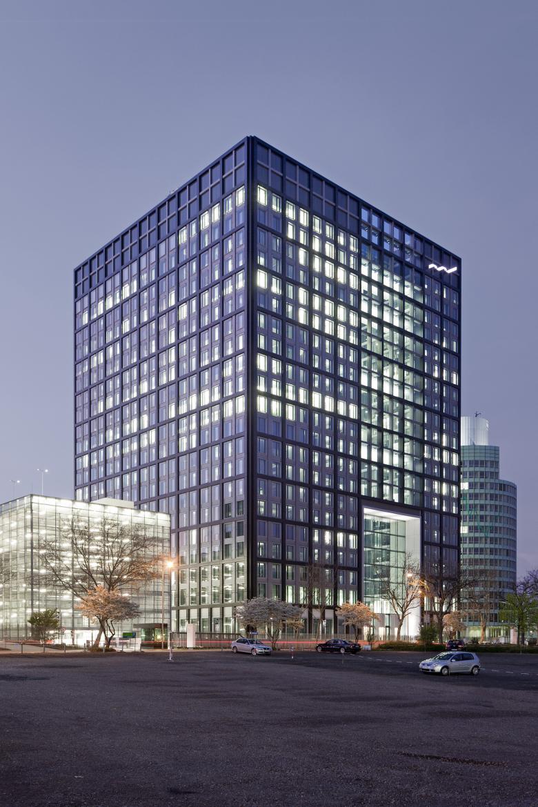 Der 87 Meter hohe Kubus markiert weithin sichtbar den neuen Standort der Deutschen Börse. Zwei L-förmige Baukörper, die punktsymmetrsich zueinander angeordnet sind, umschließen die zentrale, rund 80 Meter hohe Eingangshalle. Vernetzt durch Brücken, Stege, Treppen entsteht ein dreidimensionaler Kommunikationsraum mit vielfältigen Sichtbeziehungen.