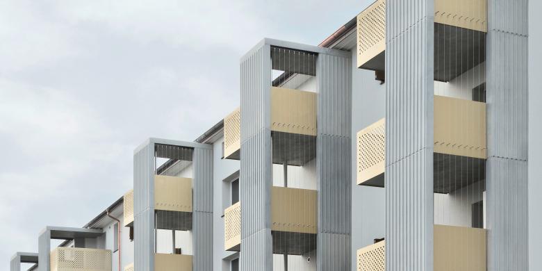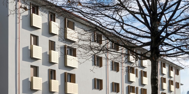 Bei der Materialisierung von den von uns geplanten Eingriffen orientierten wir uns an weiteren Bauten der Architekten Richner und Anliker aus den 40-er Jahren. Das vertikale Trapezmotiv an den Betonelementen spiegelt die ursprünglichen Blechverkleidungen der Balkonbrüstungen wieder.