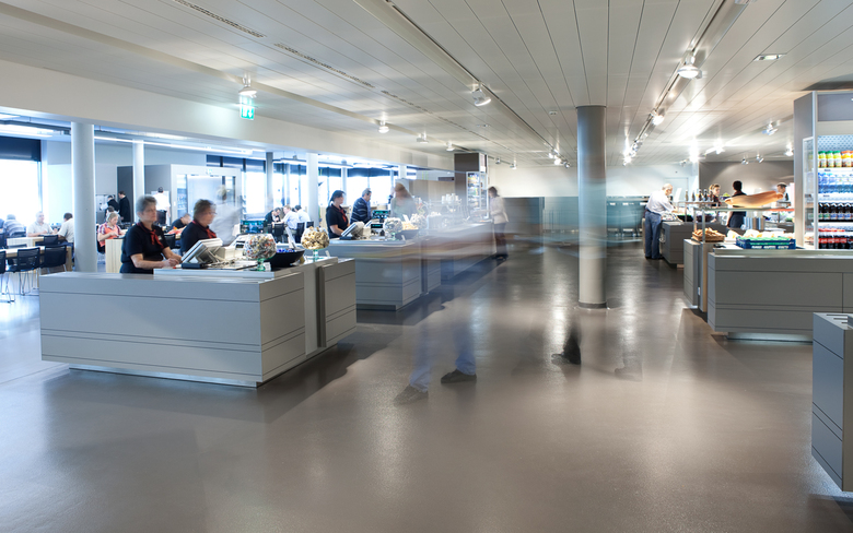 Das Konzept greift mit modernen langen Tischen die traditionelle „grosse Tafel“ auf, die die gemeinsame Mahlzeit fördert. In der Cafézone, die in Steh- und Loungebereich gegliedert ist, klingt in entspannter Atmosphäre die Mittagspause aus. Das grosse Raumvolumen wird durch die gestaffelte Farbnuancierung der Decken- und Wandelemente zoniert.