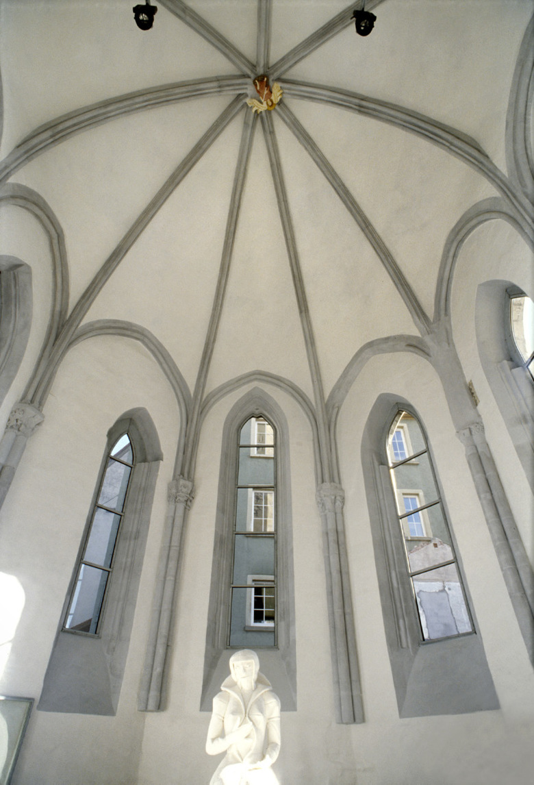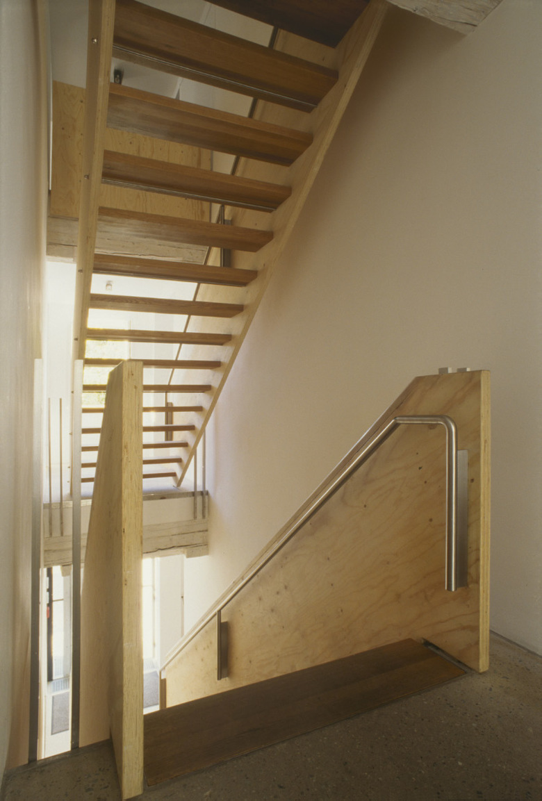 Die Fenster erhielten die historischen Lichtöffnungen, die eingesetzten Rahmen sind fein gegliedert und als zeitgenössische Konstruktion sichtbar und mit Isolierscheiben verglast. Eine Gestaltung der Glasflächen wurde überlegt. Eine historisierende Gestaltung wurde vom Denkmalamt und uns abgelehnt. Ein Vorschlag der Grafikerin Caroline Pöll, die Scheiben mit freien geschwungenen Linien zu gestalten, wurde nicht aufgenommen.
