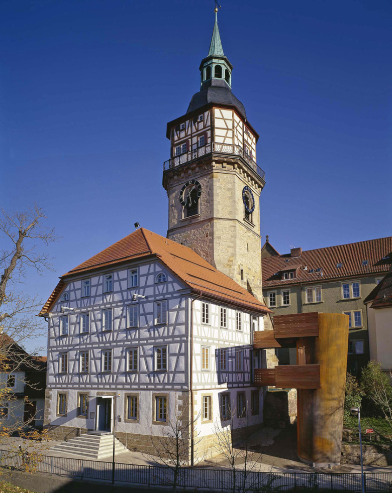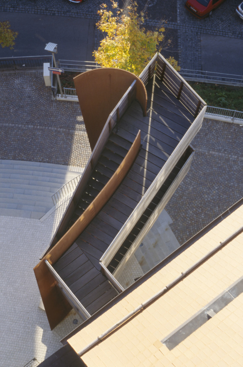 Um den Turm, der vorab vom städtischen Hochbauamt saniert wurde, der Öffentlichkeit als Aussichtspunkt zugänglich zu machen und den alten Chorraum wieder herzustellen, wurde nach einem feuerpolizeilich notwendigen Fluchtweg gesucht. In einer Mehrfachbeauftragung, die wir für uns entscheiden konnten, schlugen wir als Alternative zu den naheliegenden Lösungen (Anbau oder vorsetzen einer sachlichen Fluchttreppe) eine "Treppenskulptur" vor.