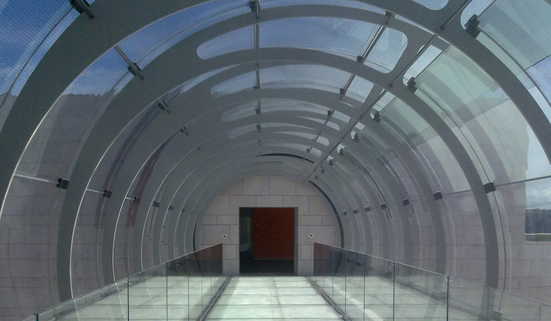 Das "Center of the Unknown", eine erst kürzlich fertiggestellte biomedizinische Forschungseinrichtung der Champalimaud Stiftung wurde von den Architekten Charles Correa Associates aus Mumbai, Indien, entworfen. Es besteht aus zwei Gebäudekomplexen, in denen die Forschungslabors, ein Auditorium und Ausstellungsbereich, sowie die Büros der Stiftung Platz finden. Das „Centre of the Unknown“ befindet sich im Stadtteil Belém, hier mündet der Fluss Tejo in den Atlantischen Ozean. Ein optisches Highlight ist die leichte, 21 Meter lange Glasbrücke mit einer Hülle aus gebogenen Scheiben, die die beiden Gebäudekomplexe miteinander verbindet. Eine filigrane unterspannte Stahlkonstruktion bildet zugleich die Unterkonstruktion für die äußere Glashülle. Auch die Gehfläche und die Brüstungen bestehen aus Glaselementen und verleihen der Gesamtkonstruktion das geforderte Maß an Eleganz und Transparenz.