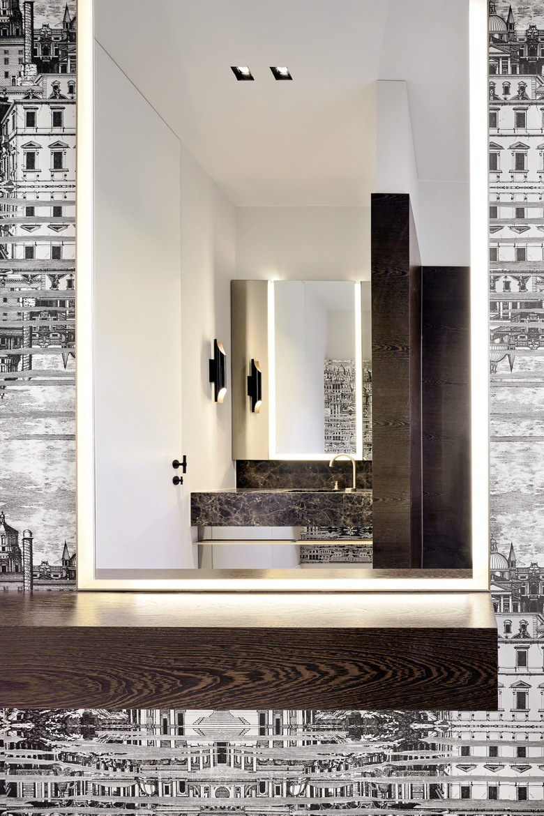 Im Lichtkonzept drückt sich die Affinität des Bauherrn zu technischer Raffinesse aus – die gesamte Technik im Haus kann von einer Applikation am Handy aus gesteuert werden. In der Küche und in den Bädern wird das Wechselspiel aus Tradition und Moderne besonders sichtbar: massives gebürstetes Messing trifft auf opulenten Emperador Marmor und dunkles massives Wenge Holz. Besonderer Wert wurde auch auf die Verwendung von nachhaltigen Materialien gelegt und eine überdauernde handwerkliche Verarbeitung.