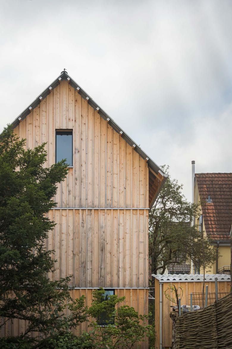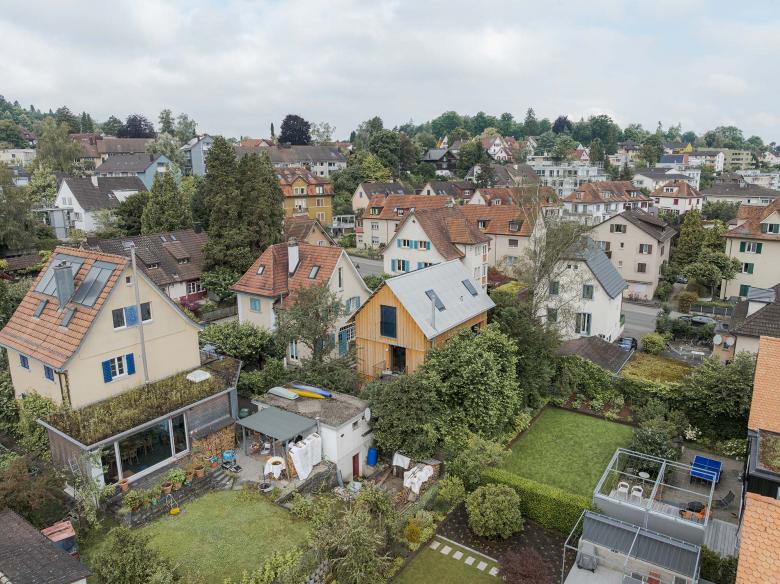 In der Tat würden viele bestehende Einfamilienhaus-Grundstücke Platz für ein zweites Gebäude bieten. Am Fusse des Eschenbergs hat ein mutiges Ehepaar das Potenzial genutzt und auf der eigenen Parzelle ein kleineres Einfamilienhaus gebaut – ein nachhaltiges Stöckli als Alterssitz. Den zu gross gewordenen Altbau vermieten sie weiter. Der dreigeschossige Neubau aus vorgefertigten Holzelementen steht im Garten, nordöstlich des bestehenden Hauses. Grenzabstände, Ausnutzung und eine sinnvolle Distanz zum Bestandesbau definieren die Aussenmasse des sechs Meter breiten und zehn Meter langen Neubaus. Um die verfügbare Fläche, die Aussicht und den Lichteinfall optimal zu nutzen, befinden sich die Küche sowie der Wohn- und Essbereich mit angrenzendem Balkon im ersten Obergeschoss. Geschlafen wird wahlweise im Erd- oder Dachgeschoss. Die Fassade mit einer vertikalen Holzschalung und das mit Welleternit gedeckte Dach heben den Neubau klar vom Altbau ab. Die in blau gehaltenen Fensterrahmen wiederum orientieren sich am bestehenden Haus. So ergibt sich eine urbane Komposition von Alt und Neu.“
