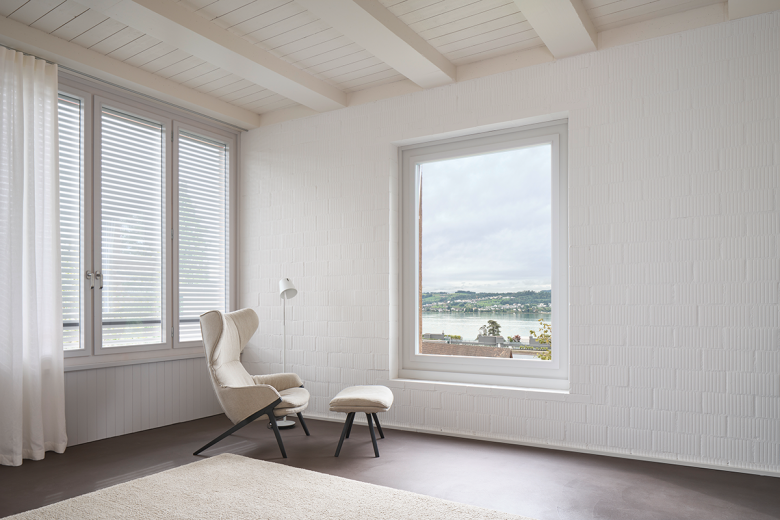 Herz jeder Wohnung ist die Küche mit einer breiten, vorgelagerten Veranda. Von hier aus kann, zwischen den Kiefern hindurch, ein Blick auf den See erhascht werden. Die Wohnungen sind als Abfolge von unterschiedlich hohen Räumen konzipiert. Im Erdgeschoss wird entlang dem Terrain auf versetzten Ebenen gewohnt, im oberen Geschoss generiert das dem Terrain folgende abgestufte Dach differenzierte Raumhöhen. Mit vielfältigen Sichtbezügen in jeder Wohnung wird Lage und Charakter des durch Fels, Kiefern und Garten geprägten Ortes erlebbar.