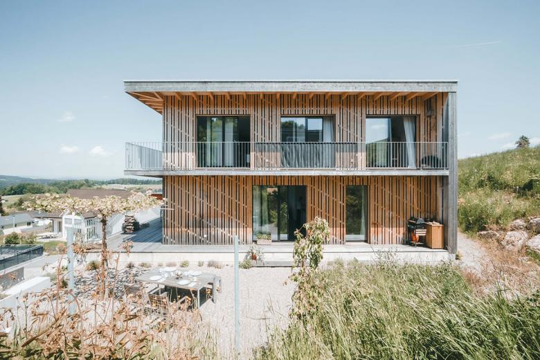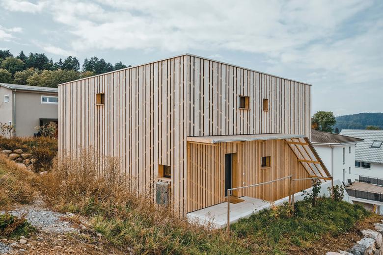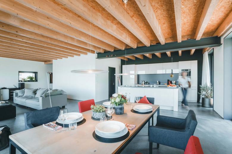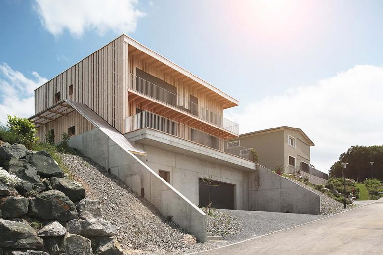 Ein grosszügiges Gebäude, wohlproportionierte Räume, ein beinahe kubischer Holzbau auf einem Betonsockel, dreigeschossig gegen Westen, Richtung Osten in den Hang "geschmiegt". Konstruktive Bauteile sind sichtbar ohne zusätzliche Verkleidungen. Ein loftartiges Raumgefühl im äusserst grosszügigen Wohn-Ess-Kochbereich. Kräftige Farbakzente im Innenraum: die Wände in einem gebrochenen Weiss die EG Decke mit sichtbaren Holzbalken, als Kontrast dazu schwarze Fensterrahmen, Leibungen und Türen. Über eine Treppe in Schwarzstahl durch einen hohen Magentafarbigen Raum gelangt man ins OG.