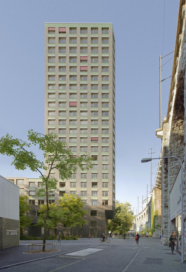 Ein Stadtblock als Ensemble von vier Häusern komplettiert die bestehende Zeile an der Limmatstrasse und verankert mit einem Hochhaus an der Kreuzung Heinrichstrasse | Viaduktstrasse das Heinrich-Areal in der Stadtsilhouette des Industriequartiers.