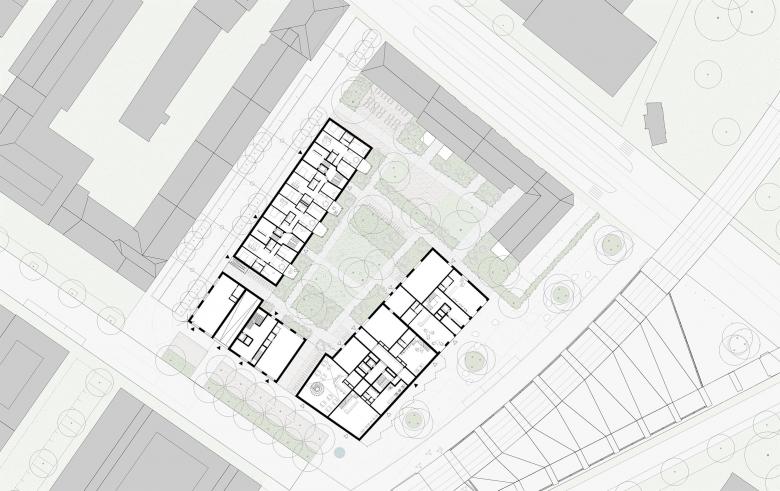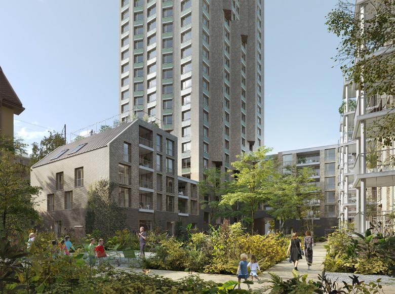 Der Innenhof versteht sich als kultivierte Stadtwildnis, deren Erscheinung massgebend vom Wunsch nach einem kühlenden, naturnahen und unversiegelten Stück Stadt geprägt wird. Unter einem transparenten Schirm lichter, einheimischer Bäume entwickelt sich zwischen direkt geführten Wegebeziehungen ein siedlungsdienliches Nebeneinander bestehend aus Grün-, Aufenthalts- und Spielflächen. Über bewusst gestaltete Portale und Torsituationen formuliert der Hof räumlich stark gefasste Übergänge