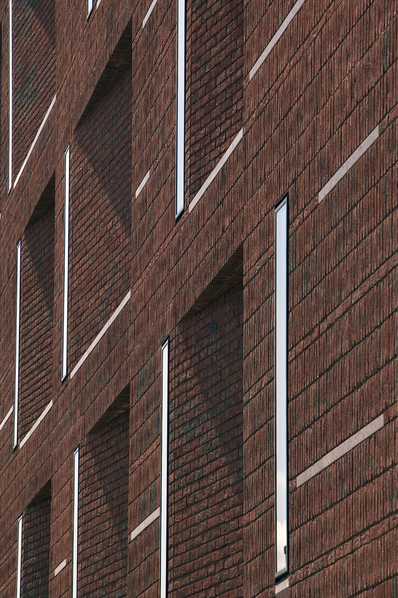 The brick surfaces are invigorated by the delicate play of light and the shadow effects of the rhythmically recurring hatchways of the upper lantern-lights. This living texture is randomly cut up by the inserted shorter longer red limestone strips. The light glints the mat mass of the brick on the polished stone, giving a quite dynamic horizontal cut to the facade.