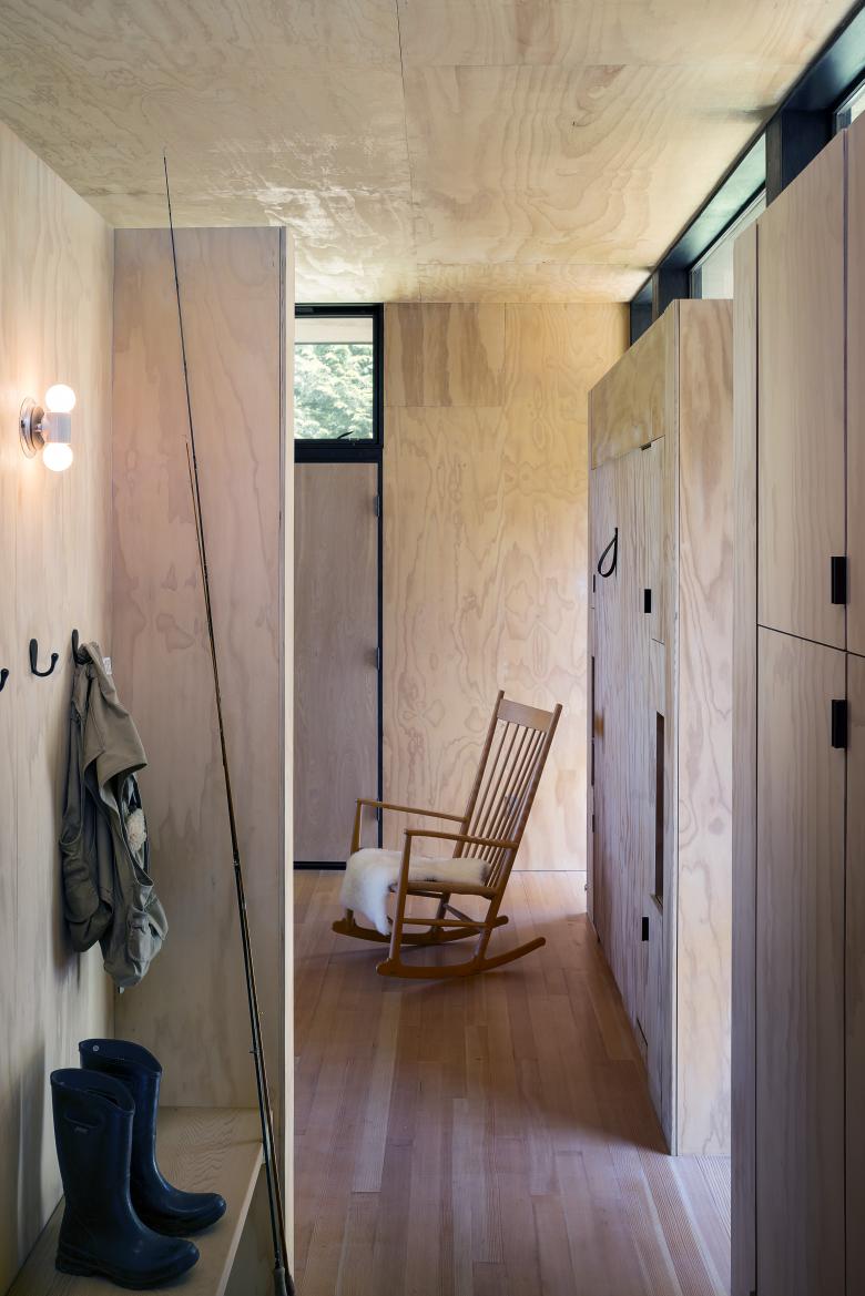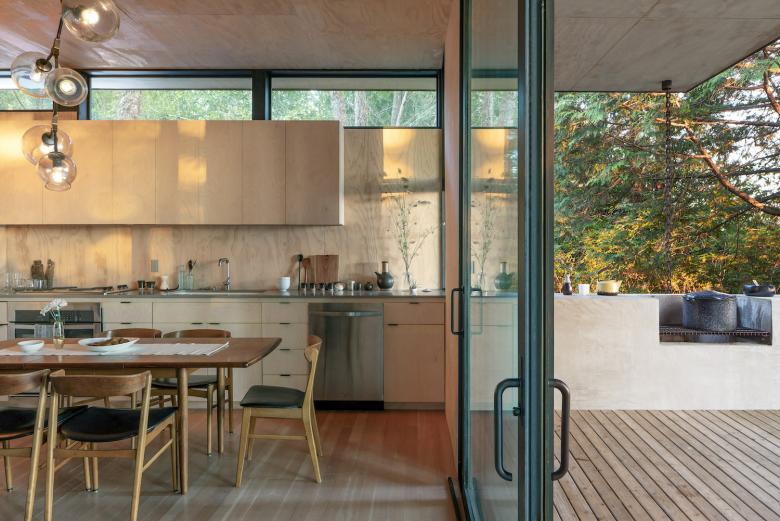 “We sought to dissolve the barriers between the inside and out, between forest, garden, and structure,” says Wittman. Sunlight warms the plywood walls and ceilings, grazing the warm cedar boards and cast-in-place concrete – allowing shadow and light to transform the simple interior into something more complex and subtle. In the main cabin, the indoor outdoor kitchen has a pass-through window that extends the interior countertop into the outdoor concrete counter and built in wood barbeque. There is a built-in Murphy bed that allows the main cabin to be a flexible sleeping area when needed. High clerestory windows allow views outdoors and natural light inside.
