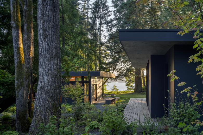 The clients wanted a retreat where they could watch birds and take in the nature of the Hood Canal. While they loved modern architecture, they did not want a building that was overly expressive of itself. They asked for a set of simple structures that would allow them to be close to the land. This resonated with Wittman, who had an appreciation for the simple vernacular structures of his rural childhood on a ranch in northern Idaho, and designs buidings allowing people to “experience the beauty of nature through architecture.” The Troth family sought a place where their friends and family could gather together while also experiencing a moment of solitude and reflection. The three single story volumes with large glass openings, sliding doors, and continuous decks allow for such gathering and reflection.