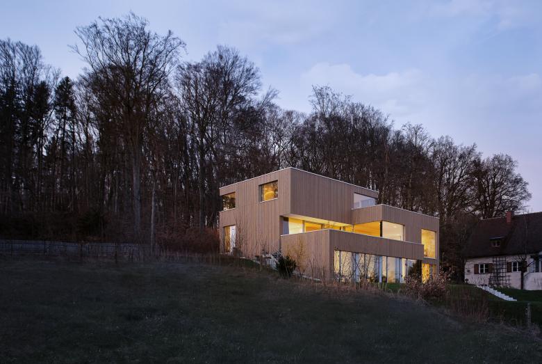 The cubic structure of the house and the steep slope intersect, arranged in a staggered formation to exploit the south-facing views towards the Alps. The photographs reveal three primary concepts — first, the framed views out to the green surroundings. Second, the birch façade that harmonises with the surrounding woodland. And thirdly, to illustrate how the building meets the steep topography.