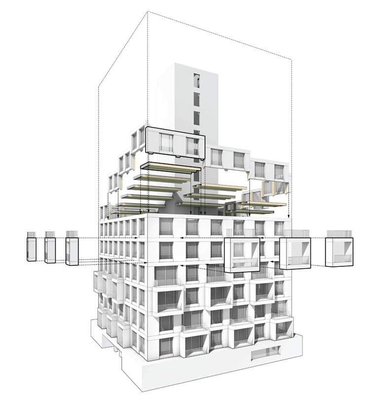 Neben Holzhybrid-Deckenelementen, die auf Holz-Doppelstützen, sowie einem Stahl-Beton-Verbundmittelträger aufliegen, sind für die Fassaden vorgefertigte Module in Holzrahmenbauweise vorgesehen, die zusammen mit den Stützen eine Montageeinheit bilden. Durch die Vorfertigung in wettergeschützten Produktionsstätten werden nicht nur Fehlerquellen minimiert, sondern auch die Bauphasen vor Ort verkürzt. Zunächst wird der massive Erschließungskern in Stahlbeton errichtet. Anschließend werden die Stützen-, Decken-, und Außenwandelemente montiert, wobei die Bauzeit eines Geschosses jeweils nur einen Tag beträgt.