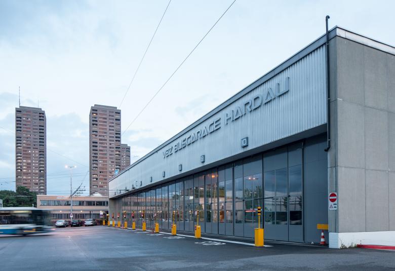 Die 1965-69 erstellte zweigeschossige Bus- und Polizeigarage Hardau wies insbesondere im Brandschutz, in der Gebäudetechnik sowie in der Gebäudehülle einen dringenden Instandsetzungsbedarf auf. Ebenso entsprachen die Arbeitsbedingungen bezüglich Raumtemperaturen, Belichtung und Belüftung nicht mehr den heutigen Vorschriften und Bedüfnissen. Zur Erfüllung der Brandschutzauflagen wurden zusätzliche Fluchtwege im Untergeschoss in die bestehenden Lichtschächte integriert. Die Instandsetzung des Daches umfasste den kompletten Ersatz der Flachdächer und der Sheddachverglasungen. So konnte das Dach entlastet, die Energieeffizienz gesteigert und mit dem Einbau der RWA-Flügel die natürliche Entrauchung sowie der sommerliche und winterliche Wärmeschutz sichergestellt werden. Das charakteristische Raster der Fassadengestaltung wurde durch neue Rahmenprofile und Isolierverglasung beibehalten. Aufgrund der fehlenden Lagerplätze wurden die angelieferten Baumaterialien in Tagesetappen verarbeitet. Da die Busgarage ein 24 Stundenbetrieb ist, erfolgten sämtliche Arbeiten unter laufendem Betrieb.