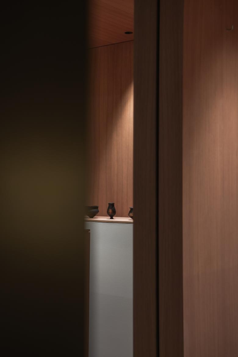 En la plant a principal se concentran la zona de exposición y la atención al cliente. La madera de roble y una moqueta gris verdosa configuran una atmósfera íntima y funcional. Un gran mostrador - expositor recorre longitudinalmente uno de los lados. Tras él, una fina poyata de madera actúa como repisa expositiva, acogiendo desde dibujos originales de la joyería hasta obras de arte y objetos que dialogan con el universo material de Sant. En el lado opuesto, una zona de espera y tres escritorios de atención refuerzan la idea de cercanía y discreción. Los sobres de piel oscura de estos escritorios están pensados para realzar la presentación de las joyas ante el cliente. Al fondo, un despacho privado, filtrado por persianas venecianas — idénticas a las del escaparate —introduce un juego de transparencias y veladuras que permite controlar cuánto se revela de lo que ocurre en su interior.
