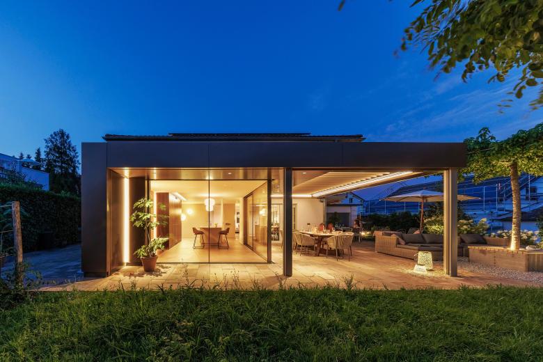Der teilverglaste, extensiv begrünte Anbau erweitert den Wohnraum und öffnet ihn zur Natur. Neigbare Lamellen sorgen für Schutz vor starker Sonneneinstrahlung oder Regen und verändern je nach Wetter und Tageszeit die Atmosphäre: mal offen und weit, mal geborgen und geschützt. So entsteht ein Ort für stille Momente, gesellige Abende und das einfache Erleben des Gartens — das ganze Jahr über.