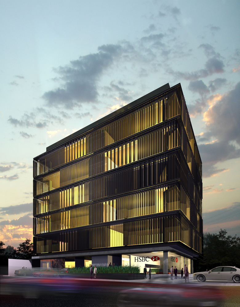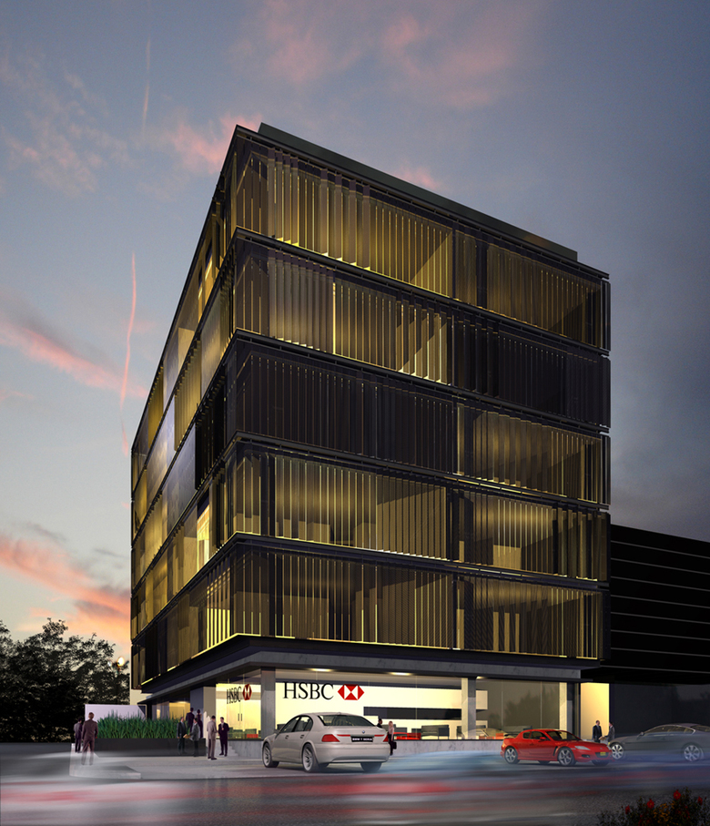 The project aims to create an imposing building that is kind to its surroundings and the environment. The office levels are covered by a double skin. The inner layer made by floor-to-ceiling sliding glass panels. The outer layer is a translucent movable mesh made of perforated aluminum panels that allow for a constantly changing façade and natural ventilation. The offices have the possibility of splitting into 4 private stalls giving the building a dynamic and variable trait. The building appears to be floating over the transparent glass base used for commercial spaces.